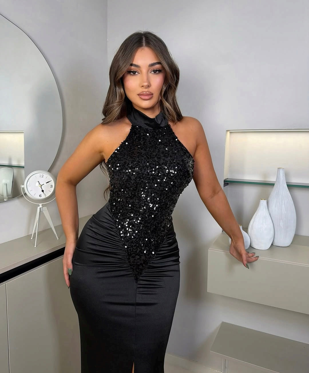 Zrób niezapomniane wrażenie w tej eleganckiej, długiej sukni wieczorowej. Suknia opada gładko wzdłuż sylwetki i pięknie przylega do szyi, tworząc wyrafinowany i kobiecy wygląd. Projekt jest idealny na wyjątkowe okazje, takie jak gale, wesela czy inne uroczyste wydarzenia. Wysokiej jakości materiał jest komfortowy w noszeniu i zapewnia luksusowe odczucie przez całą wieczór. Połącz ją z subtelnymi dodatkami i eleganckimi butami, aby uzyskać stylowy i ponadczasowy look.