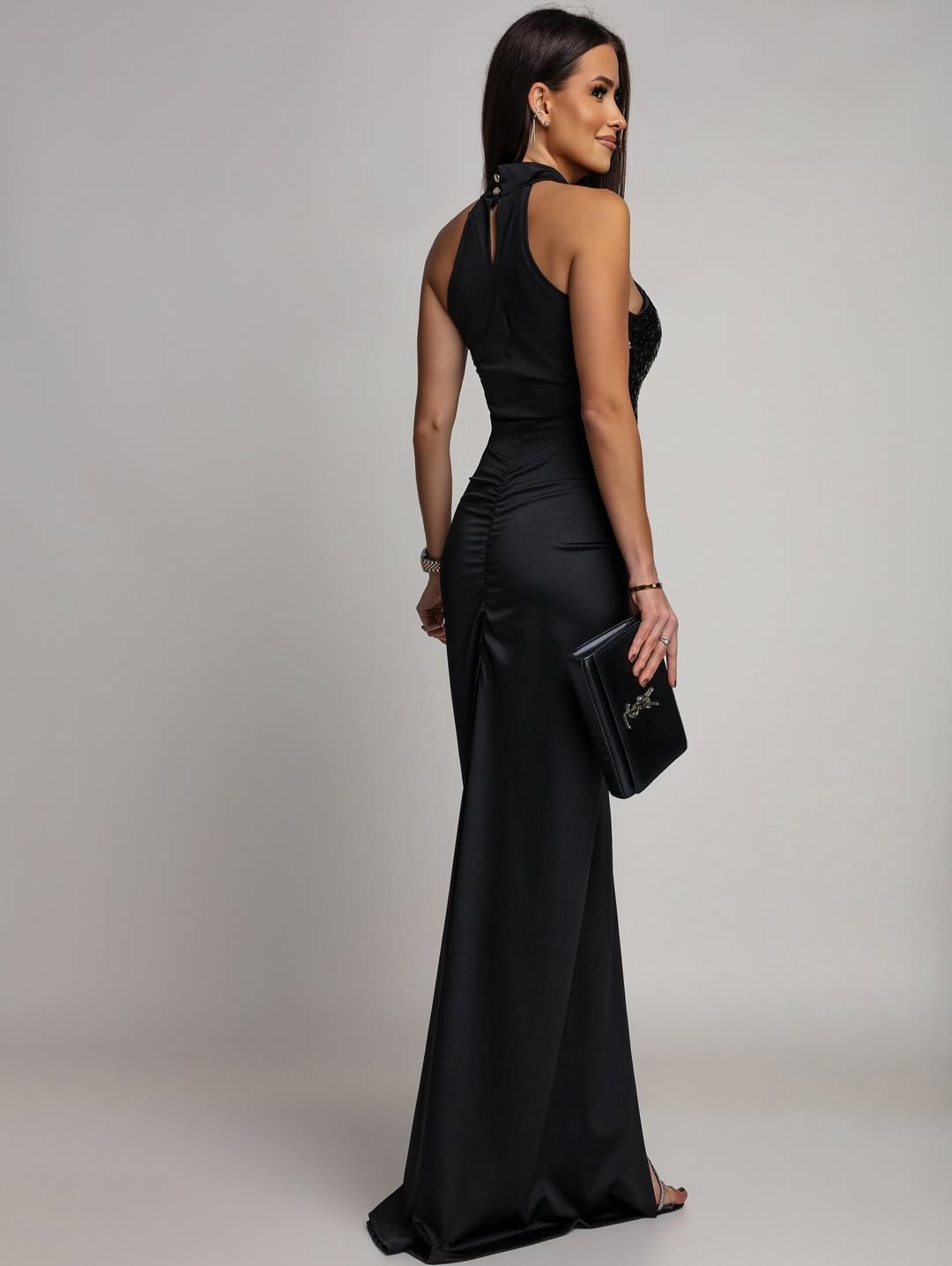 Aleksandra I sukienka czarna – długi fason dopasowany przy szyi, idealna na wyjątkowe okazje i przyjęcia