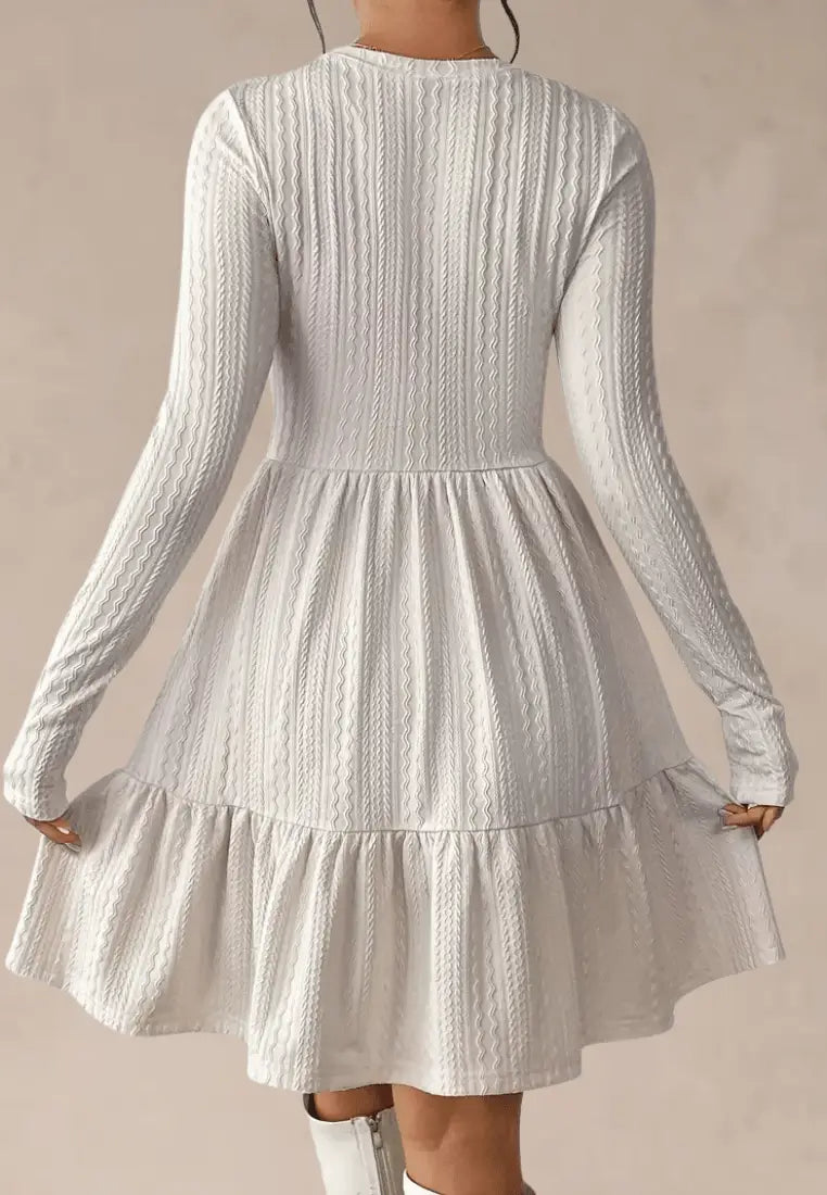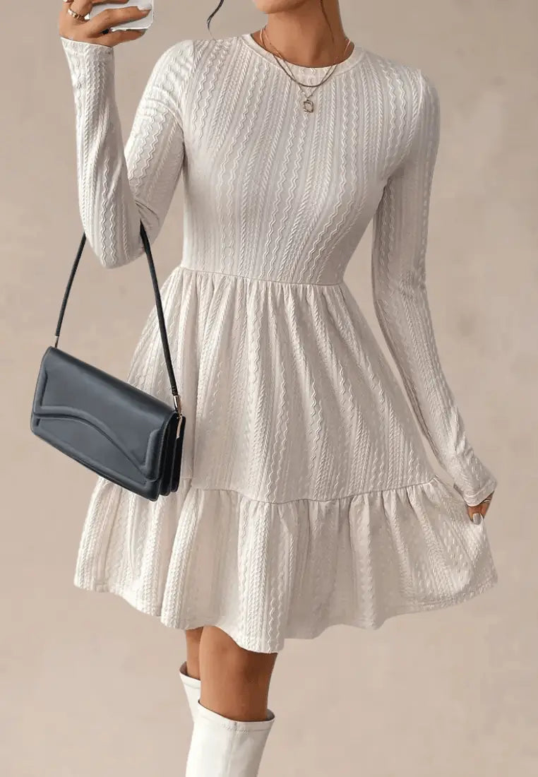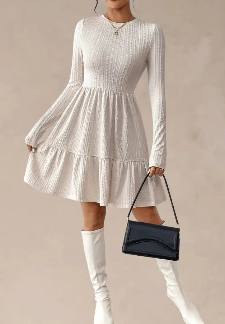 KATARZYNA to urocza sukienka dzianinowa w kolorze ecru z falbaną i długimi rękawami — połączenie kobiecego uroku oraz wygody. Uszyta z miękkiej i elastycznej dzianiny świetnie układa się na sylwetce, gwarantując komfort noszenia przez cały dzień. Delikatny, prążkowany materiał nadaje jej szykownego charakteru, a lekko rozkloszowany dół wykończony subtelną falbaną wprowadza lekkość i romantyczny akcent. Dzięki długim rękawom model ten doskonale sprawdzi się w chłodniejsze dni.